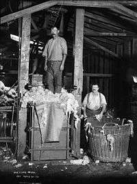 Pressing and branding are typically carried out by a woolpresser in the larger shearing sheds.[6] In small sheds, the pressing may be done by the woolclasser, wool handler or sheep owner. A woolpresser may perform the combined duties of woolpressing and penning up the sheep for the shearers. The latter arrangement means less interruption to the flow of the wool across the table and into the wool bins.[5]