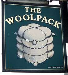 Sign for the Woolpack public house, Fishbourne, West Sussex, showing the historic form of the modern wool bale