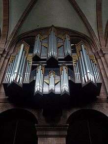 Before the destruction of Worms in 1689 during the Nine Years War, six bells hung in the four towers of the church. In 1728, the Dom received a new six part peal. In the course of the Secularisation at the end of the 18th century, these bells were confiscated. When the Dom became a parish church, four bells were hung in the southeast tower, with the strike tone sequence h0–dis1–fis1–gis1.[13] They were destroyed by aerial bombing at the end of the Second World War.[14]