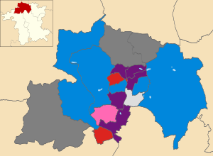 Summary of the council composition after recent council elections, click on the year for full details of each election. Boundary changes took place for the 2004 and 2015 elections, leading to the whole council bring elected in those years.[6][7] The number of councillors was reduced from 42 to 33 for the 2015 election.[1]