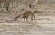 The striped ground squirrel (Xerus erythropus) is a species of squirrel native to Africa. It was first described by Geoffroy in 1803,[1][3] but the original publication may be unavailable, so that the binomial authority is today more often cited as "Desmarest, 1817".[2] There are six subspecies. It is a moderately large ground squirrel with sandy-brown or dark-brown fur with a white lateral stripe and whitish underparts. Adults live alone or in pairs in a simple burrow with a central nest, foraging, mostly on the ground, for seeds, nuts and roots, and caching excess food under stones. This is a common species with a wide range and the International Union for Conservation of Nature has rated its conservation status as being of "least concern".