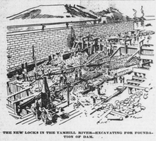 Lock completion had been intended for 1899, but five freshets on the Yamhill river prevented this.[3] The Yamhill river stayed high later than usual, and when the fall rains came, the cofferdam was washed away, so work had to be suspended until lower water and better weather arrived in 1900.[3]