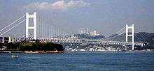 The Kita Bisan-Seto Bridge (34°23′43.5″N 133°49′13.7″E / 34.395417°N 133.820472°E / 34.395417; 133.820472 北備讃瀬戸大橋 Kita Bisan Seto Ō-hashi) is a double-decked suspension bridge with two sections linked by a common anchorage between them. The center span is 990 meters (3,248 ft) and the total length is 1,538 m (5,046 ft). It is the 19th largest suspension bridge in the world. The nearly identical Minami Bisan Seto Bridge is located immediately to the south.