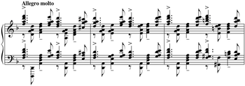 Especially important is Rachmaninoff's use of unusually widely spaced chords for bell-like sounds: this occurs in many pieces, most notably in the choral symphony The Bells, the Second Piano Concerto, the E flat major Étude-Tableaux (Op. 33, No. 7), and the B-minor Prelude (Op. 32, No. 10). "It is not enough to say that the church bells of Novgorod, St Petersburg and Moscow influenced Rachmaninov and feature prominently in his music. This much is self-evident. What is extraordinary is the variety of bell sounds and breadth of structural and other functions they fulfil."[82] He was also fond of Russian Orthodox chants. He uses them most perceptibly in his Vespers, but many of his melodies found their origins in these chants. The opening melody of the First Symphony is derived from chants. (The opening melody of the Third Piano Concerto, on the other hand, is not derived from chants; when asked, Rachmaninoff said that "it had written itself".)[83]