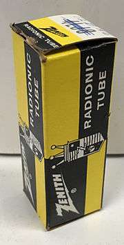 The company was co-founded by Ralph Matthews and Karl Hassel[2] in Chicago, Illinois as Chicago Radio Labs[3] in 1918 as a small producer of amateur radio equipment. The name "Zenith" came from ZN'th, a contraction of its founders' ham radio call sign, 9ZN. They were joined in 1921 by Eugene F. McDonald,[3] and Zenith Radio Company was formally incorporated in 1923. Zenith introduced the first portable radio in 1924,[3] the first mass-produced AC radio in 1926,[3] and push-button tuning in 1927.[3] It added automobile radios in the 1930s with its Model 460, promoting the fact that it needed no separate generator or battery, selling at US$59.95.[4] The first Zenith television set appeared in 1939, with its first commercial sets sold to the public in 1948.[3] The company is credited with having invented such things as the wireless remote control and FM multiplex stereo. In fact, Zenith established one of the very first FM stations in the country in 1940 (Chicago's WWZR, later called WEFM, named for Zenith executive Eugene F. McDonald), which was among the earliest FM multiplex stereo stations, first broadcasting in stereo in June 1961. The station was sold in the early 1970s and is now WUSN. Zenith also pioneered in the development of high-contrast and flat-face picture tubes, and the multichannel television sound (MTS) stereo system used on analog television broadcasts in the United States and Canada (as opposed to the BBC-developed NICAM digital stereo sound system for analog television broadcasts, used in many places around the world.) Zenith was also one of the first companies to introduce a digital HDTV system implementation, parts of which were included in the ATSC standard starting with the 1993 model Grand Alliance. They were also one of the first American manufacturers to market a home VCR, selling a Sony-built Betamax video recorder starting in 1977.